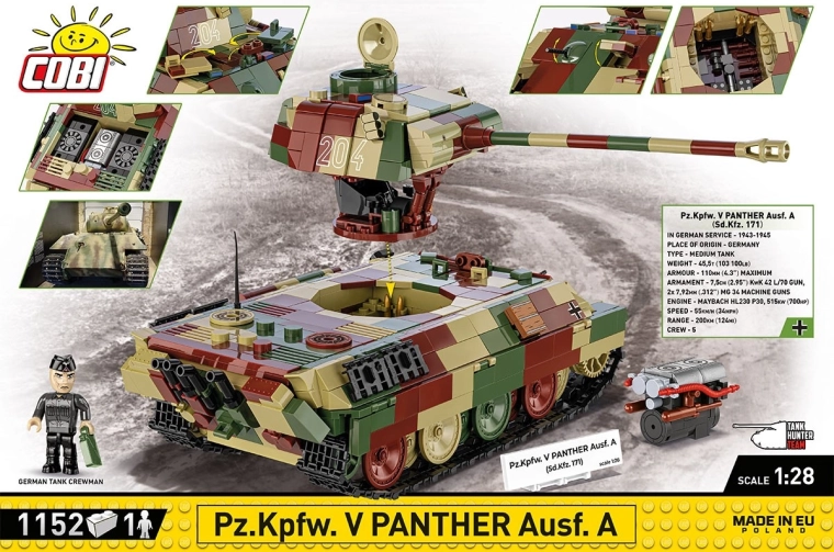 Predstavljamo dovršen gradbeni komplet, navdihnjen s slavnim Pz.Kpfw. V Panther Ausf. A (Sd.Kfz. 171) – ikono druge svetovne vojne. Model zvesto zajame obliko in proporce izvirnika, vključno s kamuflažnim barvanjem. Zahvaljujoč vrtljivi kupoli, premični cevi in funkcionalnim gosenicam boste uživali v realistični razstavi in dinamični igri. Snemljiva kupola omogoča dostop do podrobne notranjosti z odstranljivim motorjem in odpirajočimi se loputami.