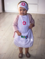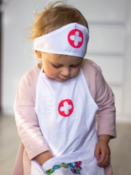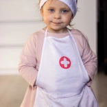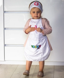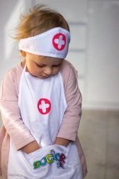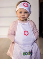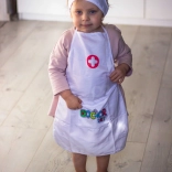 Lahek predpasnik s praktičnimi žepi sprejme stetoskop in druge otroške pripomočke, da je igra zdravnika vedno pri roki.