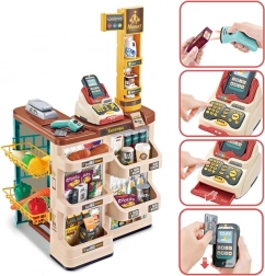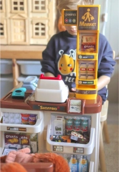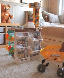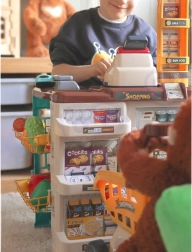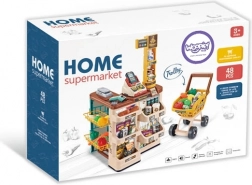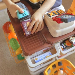 Z nizom Woopie supermarket otroci odkrivajo svet nakupovanja in osnove računanja. Resnični elementi, kot so svetleči in zvočni skener, blagajna z izvlečnim predalom in mehanska tehtnica, zvesto posnemajo pravo trgovino. Stabilen pult z obešalnimi in policnimi mesti za blago ter preglednimi oznako cen spodbuja samostojnost in organiziranost.