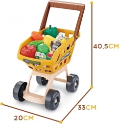 Del kompleta sta košara/voziček in veliko živil, kot so sadje, zelenjava, mleko ali sok – vse za popolno igro trgovine.