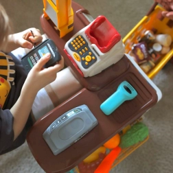Blagajna z izvlečnim predalom za denar, čitalnikom kartic in skenerjem, ki sveti in oddaja zvok, otrokom prinaša avtentično izkušnjo nakupovanja.