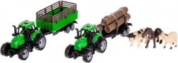 Zeleni traktorji z odklopnimi vozički posnemajo pravo delo na kmetiji – od odvoza sena do prevoza lesa ali živali.