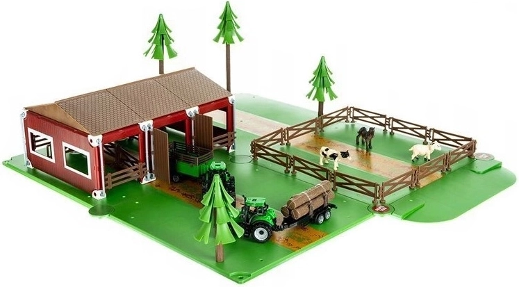 Zgradite si svojo kmetijo v hipu – plošče preprosto povežete s krožci, dodatke (drevesa, ograje ali transporterje) pa trdno pritrdite, da vse ostane na mestu tudi pri dinamični igri. Realistična traktorja z odklopnimi prikolicami podpirata domiselne scenarije od žetve do skrbi za živali.