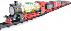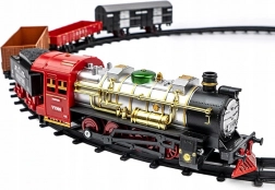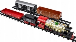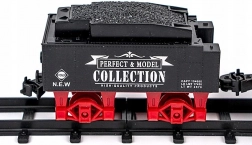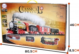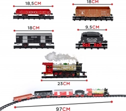 Komplet vsebuje 29 delov: lokomotivo, vagon za premog in vagone, s katerimi si otroci postavijo lasten krog dimenzij 170 × 82 cm. Skupna dolžina garniture je približno 94 cm, dolžina tirov 460 cm. Odlično darilo, ki podpira razvoj domišljije in ročnih spretnosti.