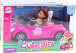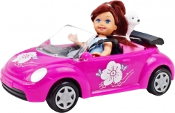Prikupna punčka sede v stilski rožnati kabriolet z odprto zasnovo, ki olajša vstavljanje in odstranjevanje figurice. Zaradi premičnih rok in nog jo zlahka posadite za volan in se odpravite na izlet z zvestim kužkom na zadnjem sedežu.