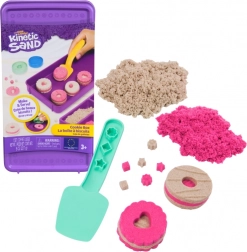 Odkrijte edinstveno teksturo Kinetic Sand in ustvarite svojo mini slaščičarno. S kombinacijo rožnatega in naravnega peska boste zlahka oblikovali »čokoladne« in »smetanaste« plasti ter z dvostranskimi modelčki pripravili najrazličnejše oblike. Lopatka z mini žigi pomaga pri dekoriranju, pokrov škatle pa služi kot pladenj za serviranje.