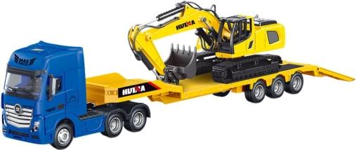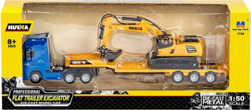 Kovinski vlačilec z nizkopodno polprikolico in bagerjem HUINA 1:50 rumen
