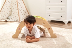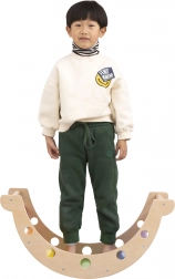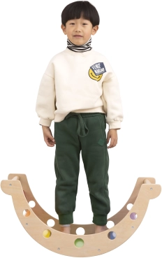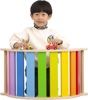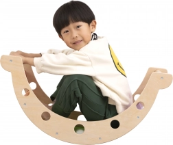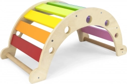 Mavrični leseni gugalnik Viga otroke navdihuje k aktivni igri in naravnemu razvoju. Pomaga trenirati ravnotežje, koordinacijske sposobnosti in grobo motoriko, hkrati pa ponuja neomejene možnosti odprte igre po načelih Montessori.