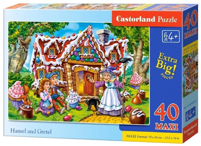 Ta velikoformatna sestavljanka z motivom pravljice Hansel and Gretel je idealna za otroke od približno 4 let. Zaradi večjih in trdnih koščkov je rokovanje enostavno, slika pa hitro oživi z jasnimi in estetskimi barvami.