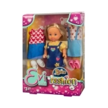 Ljubka punčka Evička je oblečena v kavbojske obleke in prihaja z še dvema barvitima outfitoma ter supergami za zabavo in stilne spremembe.