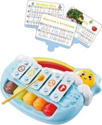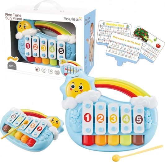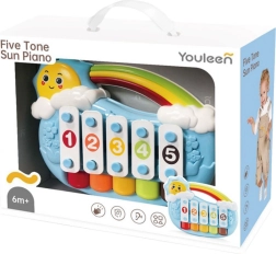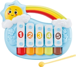 Odkrijte prve glasbene korake svojega malčka s pianinom v obliki sončka. Mehansko ustvarjanje tonov brez baterij je intuitivno in varno – dovolj je nežen dotik po tipkah. Kontrastne barve pritegnejo pozornost, priložene notne kartice olajšajo učenje preprostih melodij in razvijajo občutek za ritem.