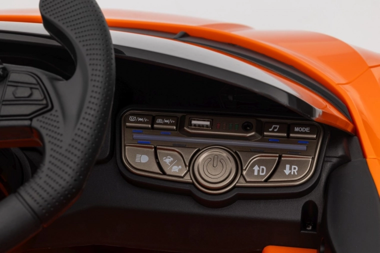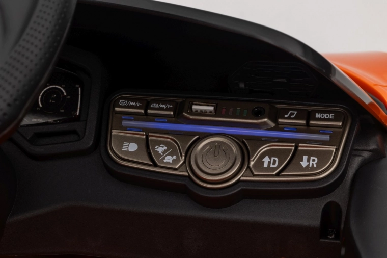 Udobje zagotavljajo mehka kolesa EVA 19×8 cm, sedež iz eko usnja z varnostnimi pasovi in pregledni prikazovalnik stanja baterije. Otroke bodo navdušile LED sprednje in zadnje luči ter multimedijski panel z Bluetooth, MP3, USB, AUX in FM radiem, vključno z zvoki in hupo na volanu.
