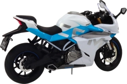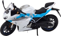 Model je opremljen s svetlobo in zvoki, ki jih napajajo baterije 3× AG13 (priložene), kar še okrepi vtis pravega stroja. Športna belo‑modra barvna kombinacija, navdihnjena z dirkalnimi motocikli, poudari dinamičen značaj in ga naredi popolno darilo za otroke in odrasle ljubitelje enoslednih vozil.