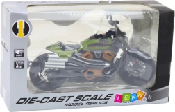 Realističen kovinski model chopperja v merilu 1:12 bo navdušil zbiratelje in ljubitelje motorjev. Ponuja podrobno izdelavo, kovinsko konstrukcijo z vzdržljivimi plastičnimi deli, svetlobne in zvočne učinke, vrtljiva kolesa, vodljivo krmilo in prožno vzmetenje. Eleganten črn dizajn z zelenimi poudarki izstopa na polici, mizi ali v vitrini.