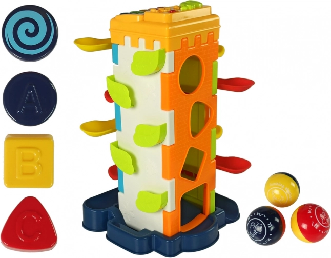 Ta pametna igrača motivira otroke k aktivni igri in razvoju veščin. Vrzite žogice v zgornjo odprtino in opazujte njihovo pot po nadstropjih navzdol. Na stranski steni bodo otroci našli razvrščevalne odprtine za različne oblike, na drugi strani pa pianino za prve glasbene poskuse. Vse je izdelano iz varne, certificirane plastike z gladkimi, mehko zaobljenimi robovi.