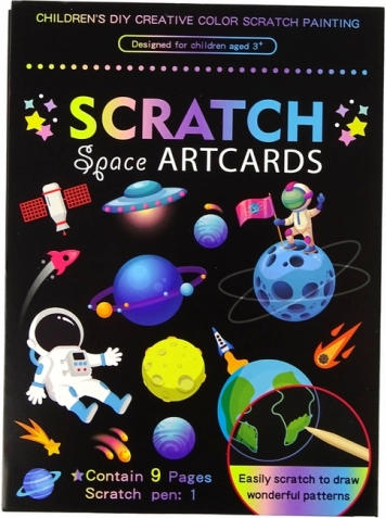Odkrijte ustvarjalno zabavo za male raziskovalce! Ta praskalna pobarvanka z vesoljskim motivom ponuja 9 barvnih slik, ki se razkrijejo po odstranitvi črne plasti z leseno lopatico. Idealno za razvoj fine motorike, kreativnosti in potrpežljivosti. Certifikat CE, v skladu z EN71, primerno za otroke od 3 let.