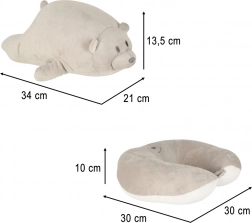 Ta praktični potovalni vzglavnik 2 v 1 je idealen za otroke in odrasle, ki iščejo udobje med potovanjem. Vzglavnik se zlahka preobrazi v plišastega medvedka, s katerim je užitek crkljati se. Ponuja odlično oporo za vrat in glavo zahvaljujoč ergonomski obliki in lahki polnitvi iz polistirenskih kroglic.