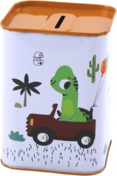 Vesela ilustracija dinozavra v avtu in barvna izvedba naredita hranilnico tudi lepo dekoracijo.