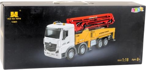 - RC betonska črpalna mešalnica HUI NA 1:18, daljinski upravljalnik 2,4 GHz, akumulator 7,4 V, USB polnilni kabel, darilna škatla