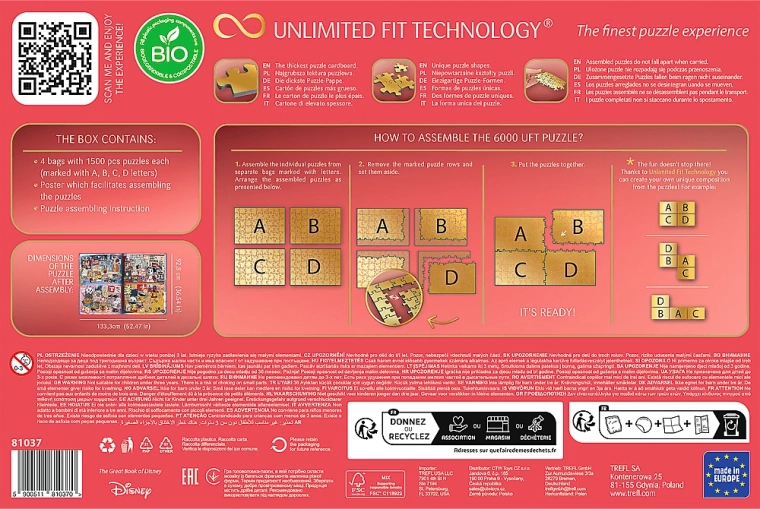 Sestavite si čarobni svet DISNEY z edinstveno sestavljanko TREFL UFT s skupno 6000 koščki. Pakiranje vsebuje štiri samostojne slike po 1500 koščkov, ki jih lahko zahvaljujoč tehnologiji Unlimited Fit Technology (UFT) poljubno povežete v eno veliko kompozicijo. Uživajte v najvišji kakovosti tiska, trdnih modrih kartonskih koščkih, enostavnem prenašanju sestavljenih delov in eko embalaži brez plastične folije.