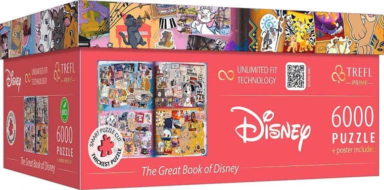 Odkrijte edinstveno »Veliko knjigo DISNEY« v obliki velikoformatne sestavljanke, ki ikončne like in prizore povezuje v eno dih jemajočo mozaiko. Zahvaljujoč tehnologiji TREFL Unlimited Fit Technology (UFT) lahko posamezne slike (4×1500 koščkov) med seboj povezujete in tako ustvarjate lastno razporeditev ali pa sledite priporočeni kompoziciji.