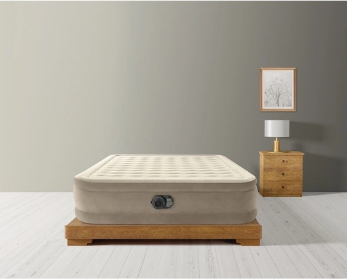 Dvoslojna napihljiva vzmetnica INTEX s tehnologijo Dura‑Beam in vlakni Fiber‑Tech ponuja visoko nosilnost 272 kg, hitro napihovanje v približno 3 minutah zahvaljujoč vgrajeni električni črpalki ter mehak velur površinski sloj za maksimalno udobje. Integriran sistem zračnih blazin zagotavlja odlično oporo glavi in vratu, vzmetnica se ne deformira in ne ugreza niti pri pogosti uporabi.