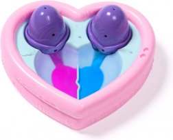 Vstavite jajčka v bazenček v obliki srca, odstranite krilca in počasi dolivajte vodo. Ko obe strani srca spremenita barvo, se figurice izvalijo. Z dodajanjem več vode se odtenki zlijejo v vijolično za še večji »wow« učinek.