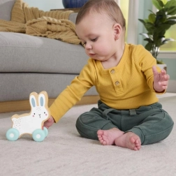Ta prikupen zajček na kolesih navdihuje najmlajše k aktivni igri – od prvih dotikov in potiskanja med sedenjem do plazenja in lovljenja igrače po tleh. Kompaktna oblika se odlično prilega majhnim rokam, gladka vožnja pa podpira koordinacijo gibov in naravno radovednost.