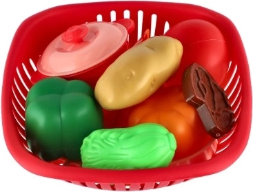 - Košarica z otroškim posodjem in dodatki (krožniki, pribor, lonci/ponve, plastična živila)