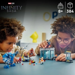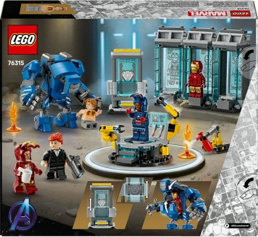 Zgradite ikonično IRON MAN oklepno sobo s prozornimi modrimi kapsulami, v katerih izstopajo trije slavni oklepi. Za akcijo poskrbi artikulirani meh Igor MK3 s kokpitom za minifigurico, par robotskih rok na servisni platformi in skener za diagnostiko. Set je idealen tako za uprizarjanje prizorov iz filmov kot za stilsko razstavljanje.