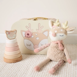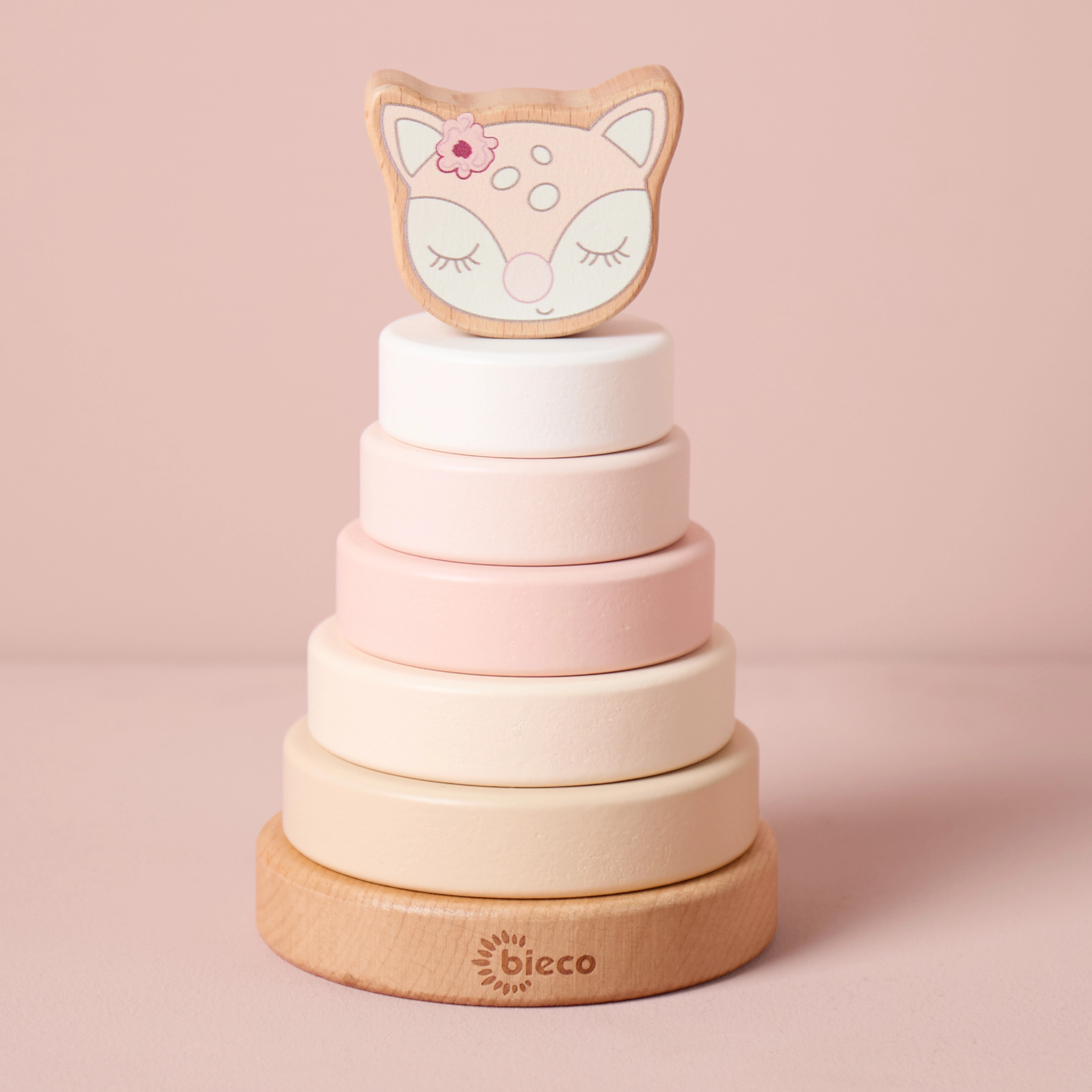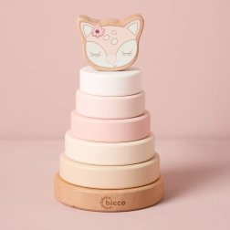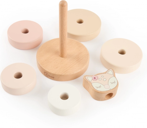 Ta sestavljiva piramida v nežnih barvah združuje otroški dizajn z obstojnim naravnim materialom. Deli so prilagojeni malim rokam, zato jih otroci zlahka primejo, pri čemer vadijo potrpežljivost in logično razmišljanje.