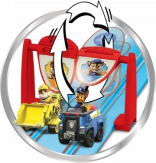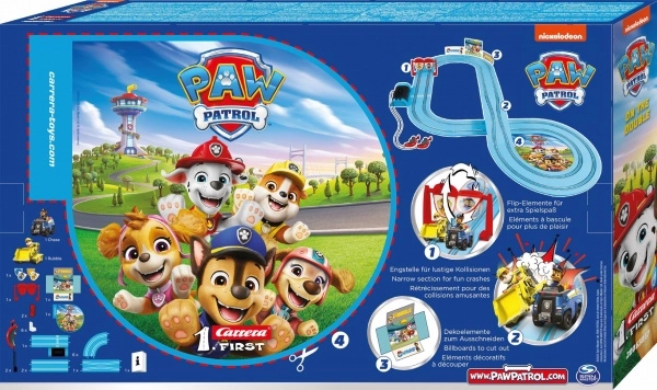 Vstopite v svet dirkanja z avtocesto Carrera First Tačke na patrulji, ki je zasnovana posebej za malčke. Steza dolžine 2,9 m z merami po sestavi 114 × 88 cm ponuja ravnine, zavoje in zabavne portale za še več akcije. Dve podrobno izdelani vozilci junakov Chase in Rubble se zahvaljujoč magnetu in kontaktnim ščetkam odlično držita na stezi.