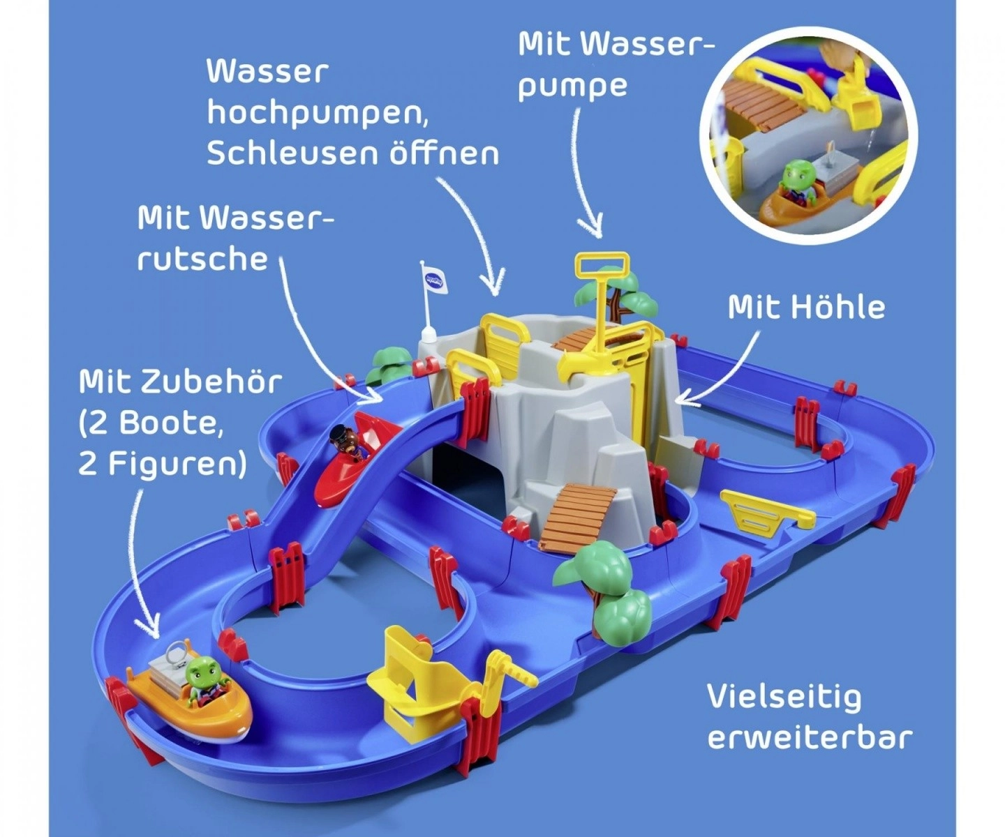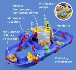 AquaPlay Gorsko jezero zagotavlja vznemirljivo zabavo. Gorski jezerni zbiralnik lahko napolnite z vodo skozi odprtino v stolpu, čolni pa zlahka drsijo skozi tunel iz jame. Sistem vodnih kanalov zagotavlja dolgotrajno zabavo. Seti AquaPlay ponujajo ustvarjalen in zabaven način učenja, kako se voda premika, dviga in naraste! Natančno zasnovana tesnila omogočajo enostavno sestavljanje in popolno vodotesnost. Vsakemu paketu je priloženo jasno navodilo za montažo.
