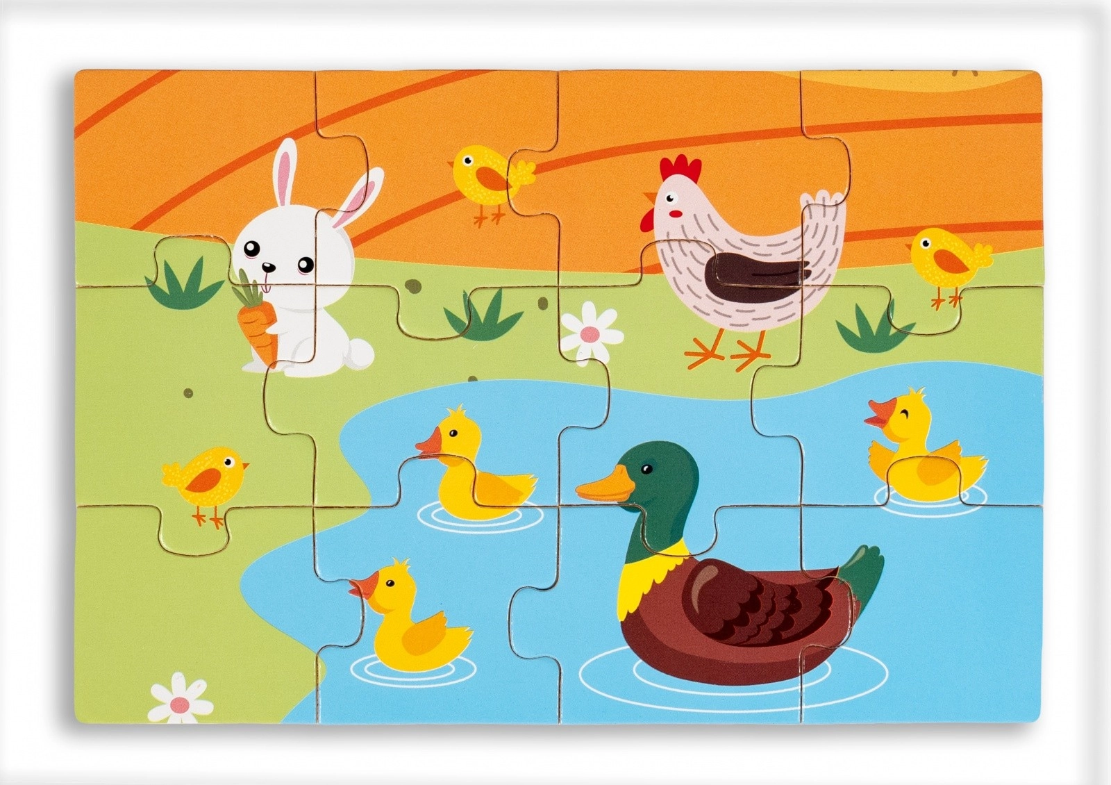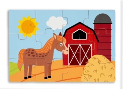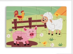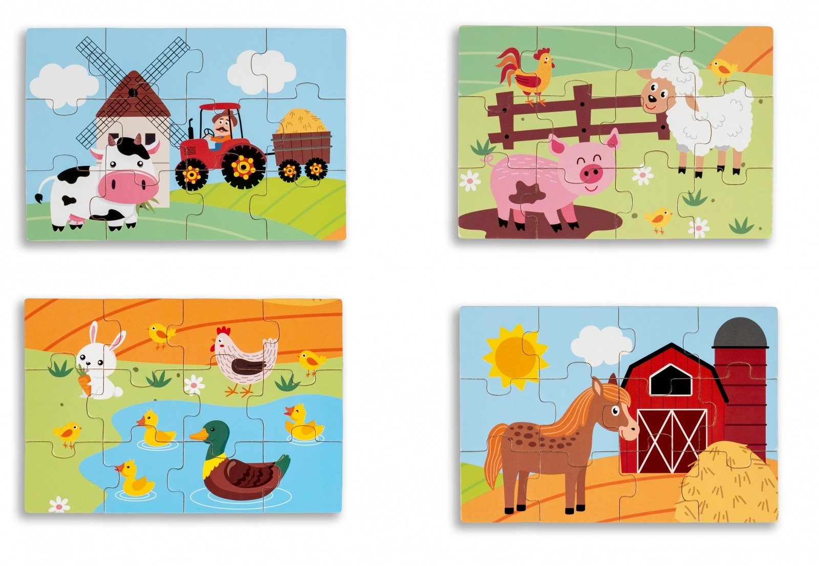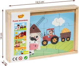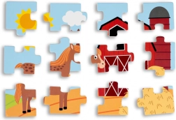 Lesene sestavljanke za otroke na temo življenja na vasi. Set vsebuje štiri barvne slike, ki predstavljajo podeželsko življenje.
