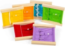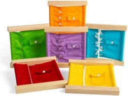 Z različnimi vrstami zapiranja si otroci varno osvojijo praktične veščine, ki jih uporabljajo vsak dan. Leseni okvirčki s tkanino so čvrsti, trpežni in izdelani iz FSC® lesa z poudarkom na trajnosti in varnosti.