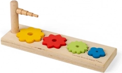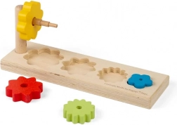 Ta lesena vstavljanka združuje vstavljanje in natikanje v eno zabavno aktivnost. Štirje barvni cvetovi se razvrščajo po velikosti in obliki, kar naravno podpira razvoj kognitivnih veščin in prostorskega zaznavanja. Otroci urijo prijem, natančnost in potrpežljivost pri pravilnem umeščanju posameznih koščkov.