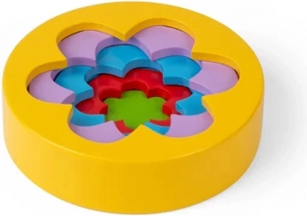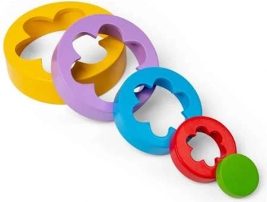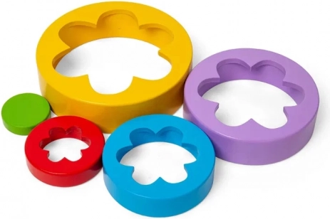 Pet delov različnih velikosti omogoča gradnjo stolpa ali ustvarjanje barvitih cvetličnih vzorcev. Otroci se naravno učijo barv in razlikovanja velikosti.