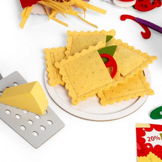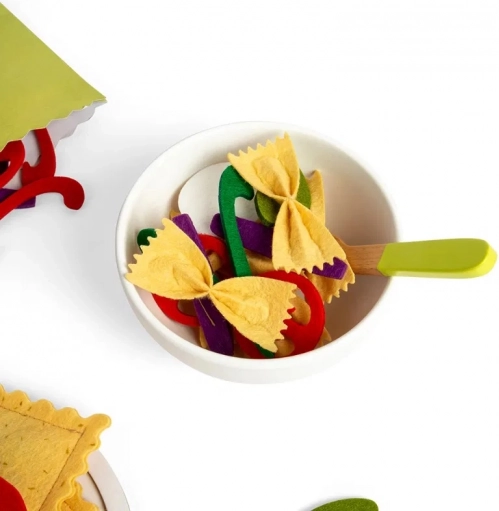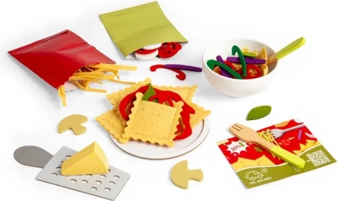 S tem vsestranskim kompletom se bodo otroci prelevili v male kuharske mojstre in pripravili svoj krožnik testenin. Barvite, mehke filcane sestavine, kot so tagliatelle, ravioli in farfalle, dopolnjujejo paradižnikova omaka, gobe, listi bazilike ter lesena skleda, krožnik, dvoje vilic in ribežen s kosom parmezana – vse za realistično kuhinjsko zabavo.
