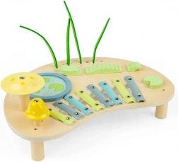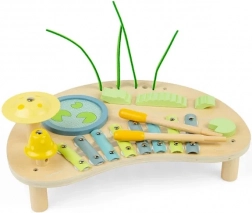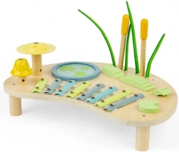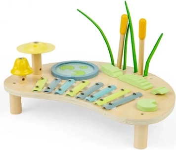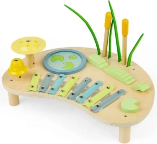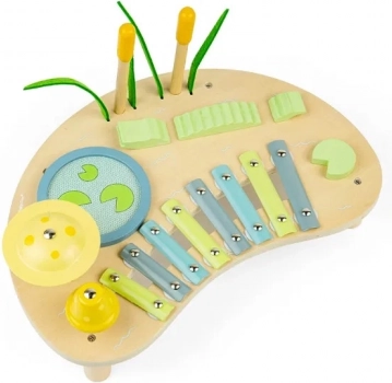 Del kompleta so vgrajeni instrumenti: ksilofon s kovinskimi ploščicami, bobenček v obliki jezerca, dvojica zvončkov in ritmični elementi, ki spominjajo na krokodila. Dve leseni paličici olajšata igro in spodbujata otroke k eksperimentiranju z ritmom in tempom. Izdelek je odgovorno izdelan iz lesa FSC in premazan z nestrupenimi barvami.