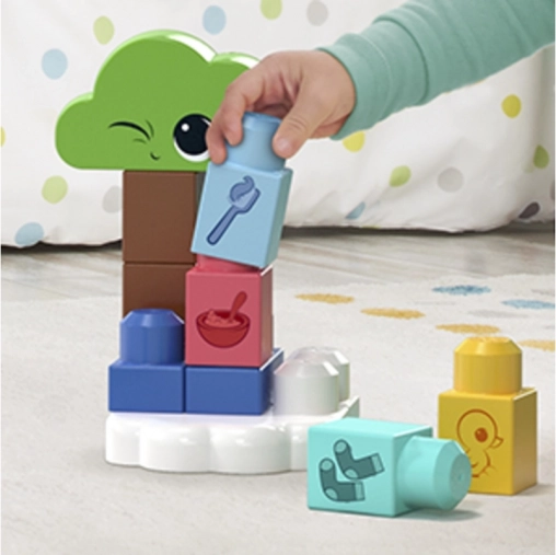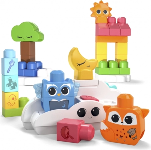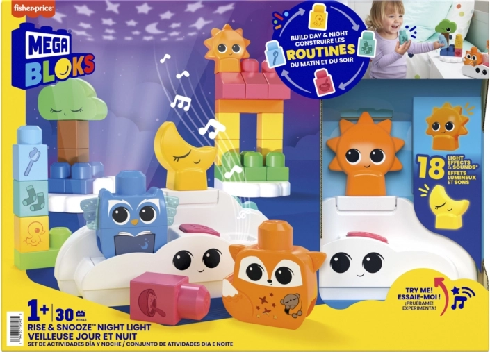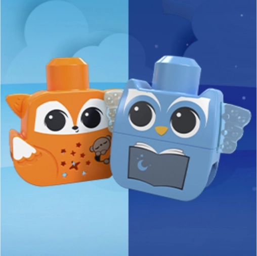 Interaktivni set Mega Bloks z nočno lučko pomaga otrokom ustvarjati zdrav jutranji in večerni ritual. Vsebuje 4 figurice in sestavljivo okolje. Na nočno lučko lahko namestite blok lune ali sonca in zaženete uspavanke, nežne zvoke, svetlobne učinke in zvezdni projektor za večer ali optimistične pesmice, zvoke okolja ter sončne svetlobne vzorce za jutro. Idealno za otroke od 1. leta.
