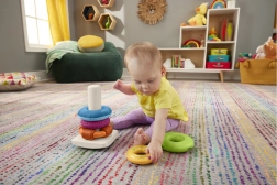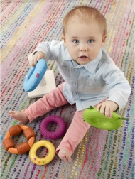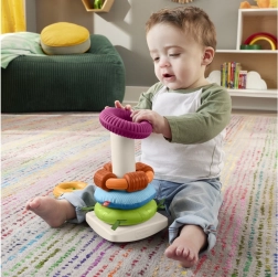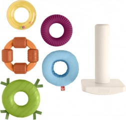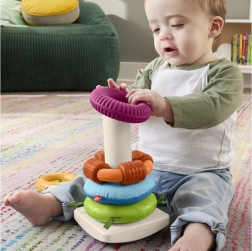 Senzorična sestavljanka Fisher-Price je sodobna različica klasične igrače s pozibavajočo se osnovo in petimi obroči različnih velikosti. Vsak obroč ponuja drugačen tip otipa – od mehkih materialov in izrazitih struktur do kroglic, ki ropotajo. Otroci naravno razvijajo spretnost skozi igro: prijemajo, stresajo, razvrščajo in zlagajo.
