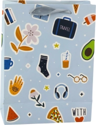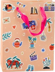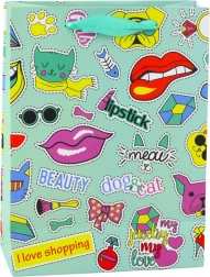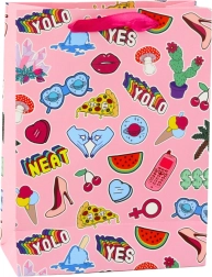 Darilna vrečka z motivom nalepk združuje različne grafične elemente, kot so srčka, ustnice, sadje in napisi, kar ji daje mladosten in izviren videz. Izdelana iz trpežnega okrasnega kartona zagotavlja varno prenašanje tudi težjih daril.