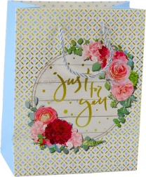 Ta elegantna darilna vrečka je okrašena z nežnimi cvetličnimi vzorci okoli zlatega napisa "Best Wishes", kar ji daje čar in poudarja posebnost darila. Izdelana je iz visokokakovostnega dekorativnega kartona, ki zagotavlja trajnost in trdnost, zato lahko varno prenašate tudi večja darila. Močni vrvni ročaji v barvi ozadja omogočajo udobno uporabo in vrečki dodajo eleganten videz.