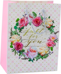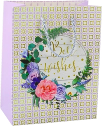 Darilna vrečka z romantičnim cvetličnim vzorcem in zlatim napisom "Best Wishes" za posebne priložnosti.