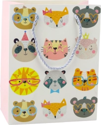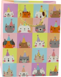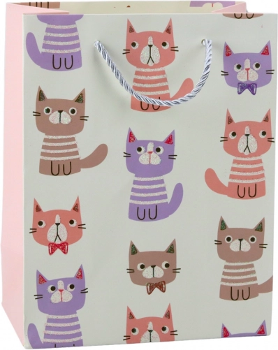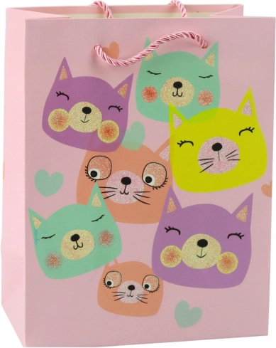 Darilna vrečka z motivi ljubkih muck v pastelnih barvah in z brokatnimi elementi.