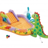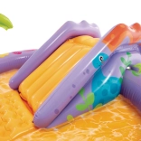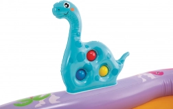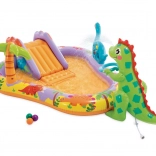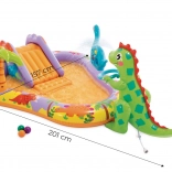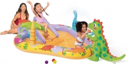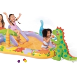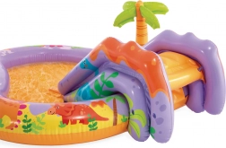 Prisrčno otroško vodno igrišče blagovne znamke INTEX z dinozavrsko tematiko ponuja tobogan, vodno prho, priključeno na vrtno cev, ter mehko pristajalno površino za varno drsenje. Del kompleta je tudi interaktivni dinozaver s košem in žogicami za metanje. Z volumnom 280 l, nosilnostjo 81 kg in hitrim izpustom je idealno za poletno zabavo otrok od 3 let dalje.