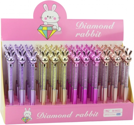 Stilski kemični svinčnik z zajčkom in bleščečimi kamenčki. Modro polnilo 0,7 mm, tekoče pisanje. 4 barve, dolžina 17 cm. Odličen za šolo in kot darilo.