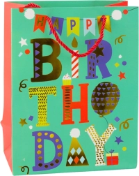 Vnesite v praznovanje barvito energijo! Ta papirnata darilna vrečka z rojstnodnevnim motivom odlično dopolni vsako darilo. Kakovosten okrasni karton zagotavlja stabilnost in zaščito vsebine, medtem ko barvno usklajeni vrvni ročaji ponujajo udobno in varno nošenje.