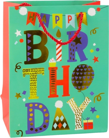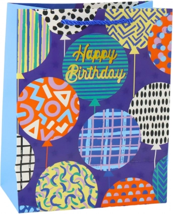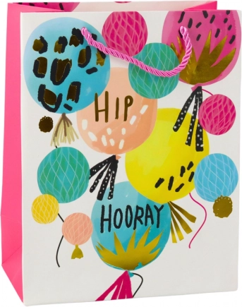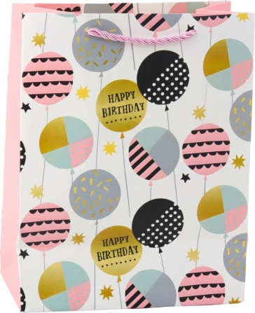Stilna rojstnodnevna darilna vrečka iz čvrstega okrasnega kartona v modernem, veselem dizajnu. Navduši z živahnimi barvami, napisi Happy Birthday in balonastimi motivi. Zahvaljujoč odpornemu materialu in vrvnatim ročajem varno prenese tudi težje darila. Univerzalna mera 23 × 18 × 10,5 cm je primerna za manjša in srednje velika presenečenja.