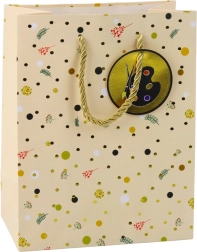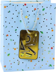 Ta darilna vrečka združuje eleganten dizajn in praktično vzdržljivost. Nežne pike, cvetlični in listni vzorci dopolnjujejo bleščeči zlati detajli ter priložena značka z motivi knjig, kalkulatorja ali slikarske palete. Zaradi dimenzij 32 × 26 × 12 cm zlahka sprejme majhna do srednje velika darila.